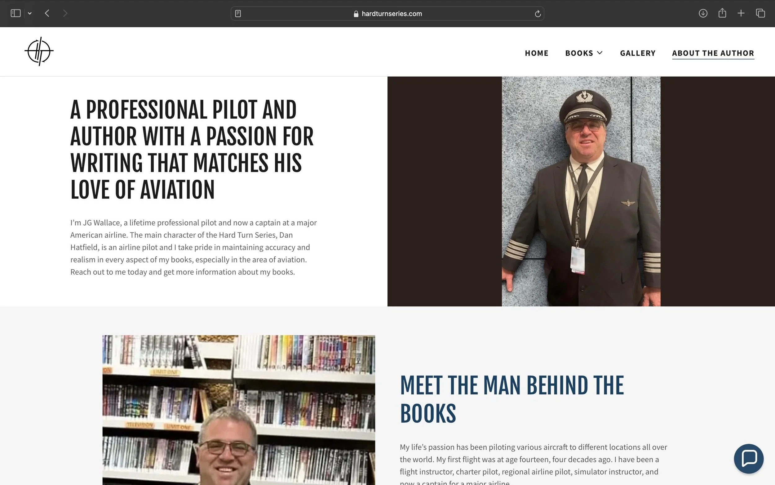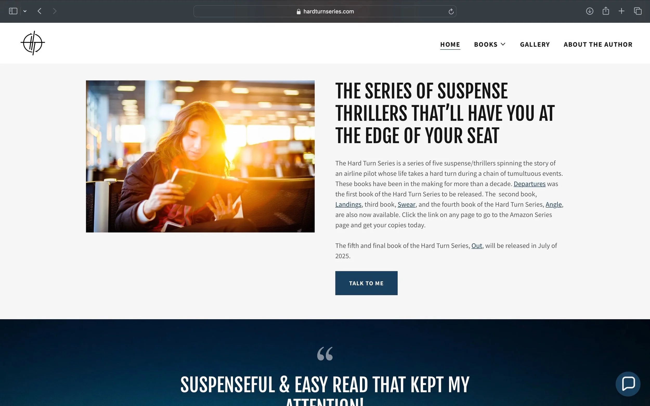 This website was built for a pilot who also happens to be the author of an action/suspense book series called The Hard Turn Series. This is a very intriguing, espionage type of story, filled with action, and the author’s knowledge of flying for a major airline. It was a lot of fun getting to put together this website with such fun, artistic book covers, and keeping a certain on-the-edge-of-your-seat kind of vibe throughout the website, all while keeping it simple and easy to navigate.